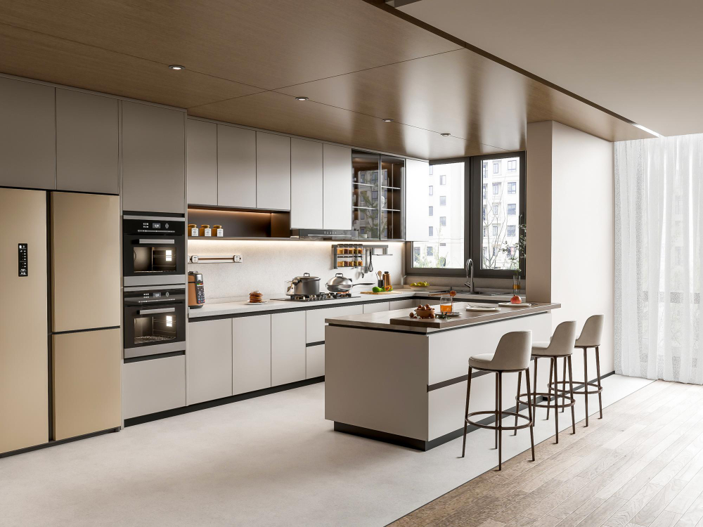 - แบบเกาะกลาง (Island): เหมาะกับครัวเปิดโล่งและมีพื้นที่กว้างขวาง โดยเกาะกลางมักถูกใช้เป็นพื้นที่เตรียมอาหารหลัก หรืออาจติดตั้งเตาและอ่างล้างจานขนาดเล็ก เพื่อแยกฟังก์ชันการทำงานออกจากผนัง